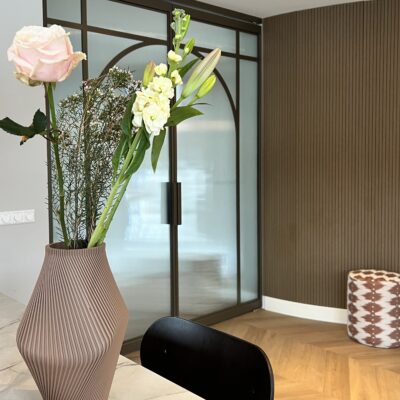 Zoals bij elk Skygate-project is ook deze deur volledig op maat ontworpen. Voor interieurontwerper Laura EngelsĀ was het ontwerp van de stalen deur een essentieel onderdeel van het interieurconcept. Zij heeft bewust gekozen voor Skygate model No 5Ā (flow collectie) uitgevoerd als dubbele taatsdeuren met aan de bovenzijde een rechte belijning gecombineerd met zachte ronde vormen. Elk detail van profielverdeling tot kleurafwerking en glassoort is zorgvuldig afgestemd op haar visie.