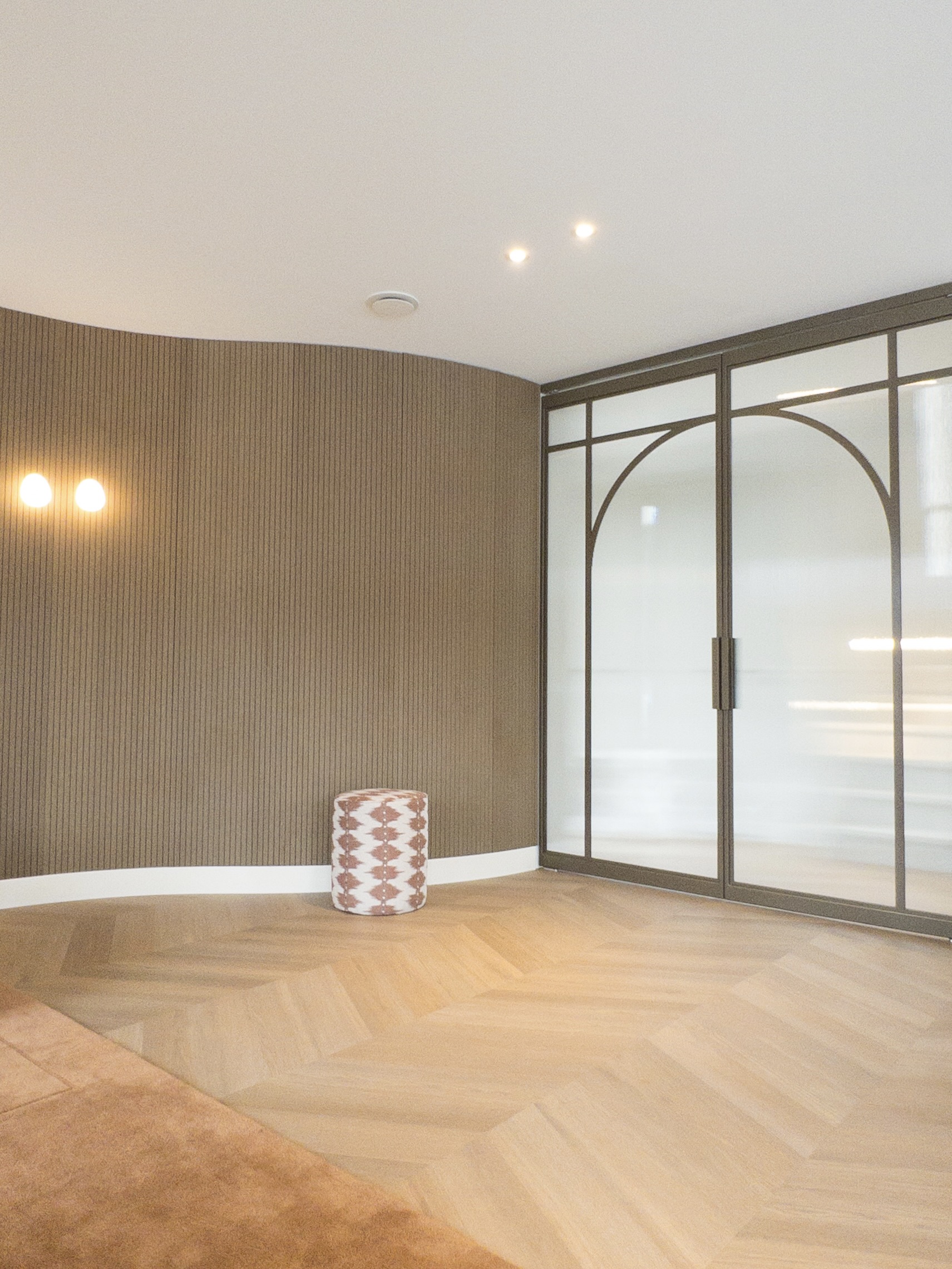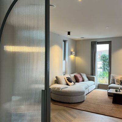 De stalen deuren zijn uitgevoerd in een warme bronstint die aansluit bij het overige beslag in de woning zoals deurklinken en verlichting. Deze metallic afwerking geeft het interieur extra diepte en karakter. Het toegepaste ribbelglas versterkt het lijnenspel en herhaalt het ritme van de architectuur. Tegelijkertijd wordt het licht op een verfijnde manier gefilterd. Een krachtig voorbeeld van maatwerk design stalen deuren van Skygate waarbij vorm en materiaal samenkomen.