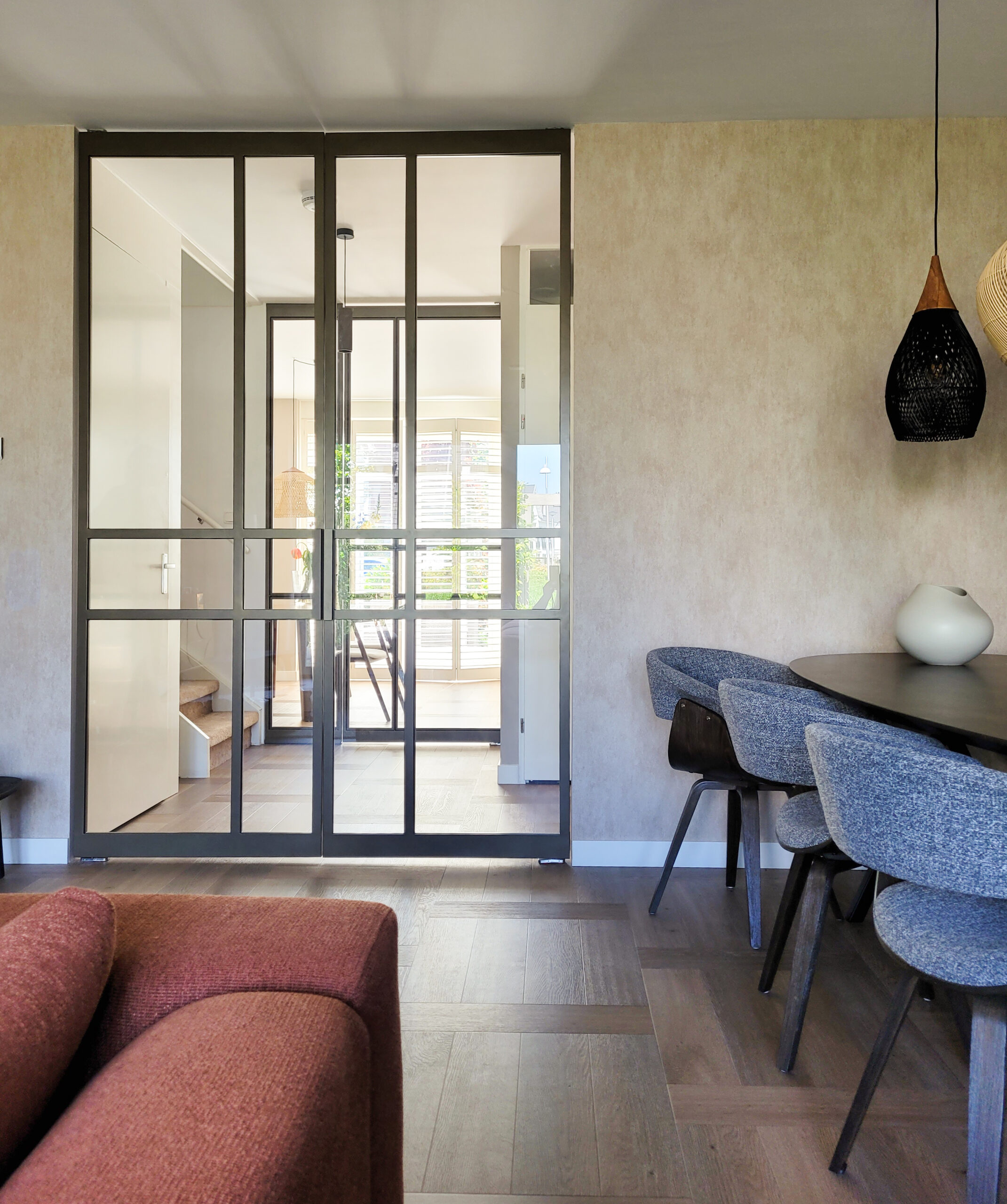 De strategische plaatsing van de taatsdeuren in de hal zorgt ervoor dat de keuken en woonkamer visueel gescheiden zijn, terwijl het toch een open geheel blijft. Door deze opstelling wordt een luxe uitstraling bereikt zonder in te boeten aan ruimtelijkheid. De transparantie van de deuren behoudt de lichtinval en zorgt voor een open, luchtige sfeer, terwijl de bronzen afwerking een verfijnde touch toevoegt.