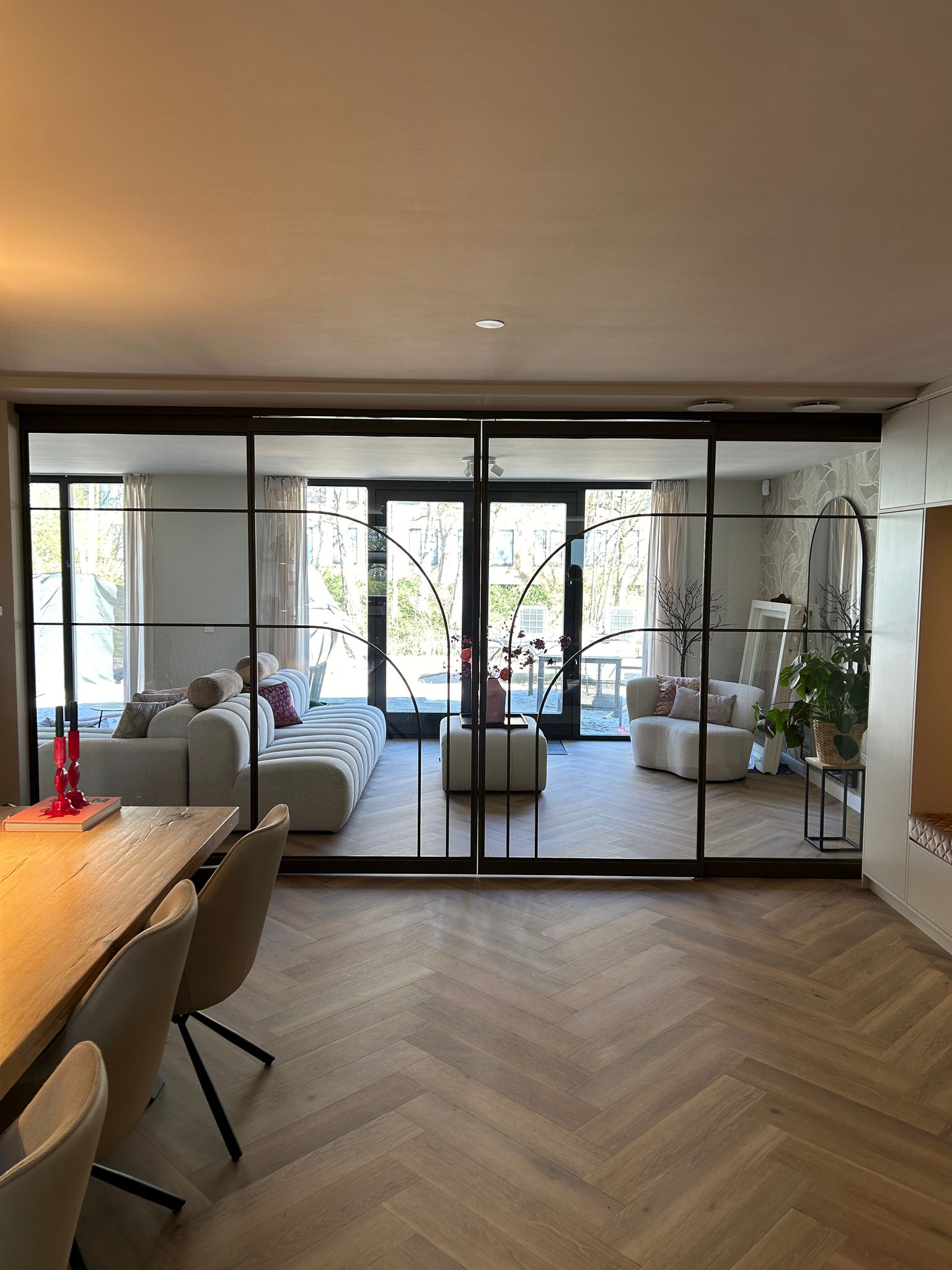 De ronde vormen van de schuifpui creëren een vloeiende overgang tussen ruimtes, waardoor een harmonieuze sfeer ontstaat.