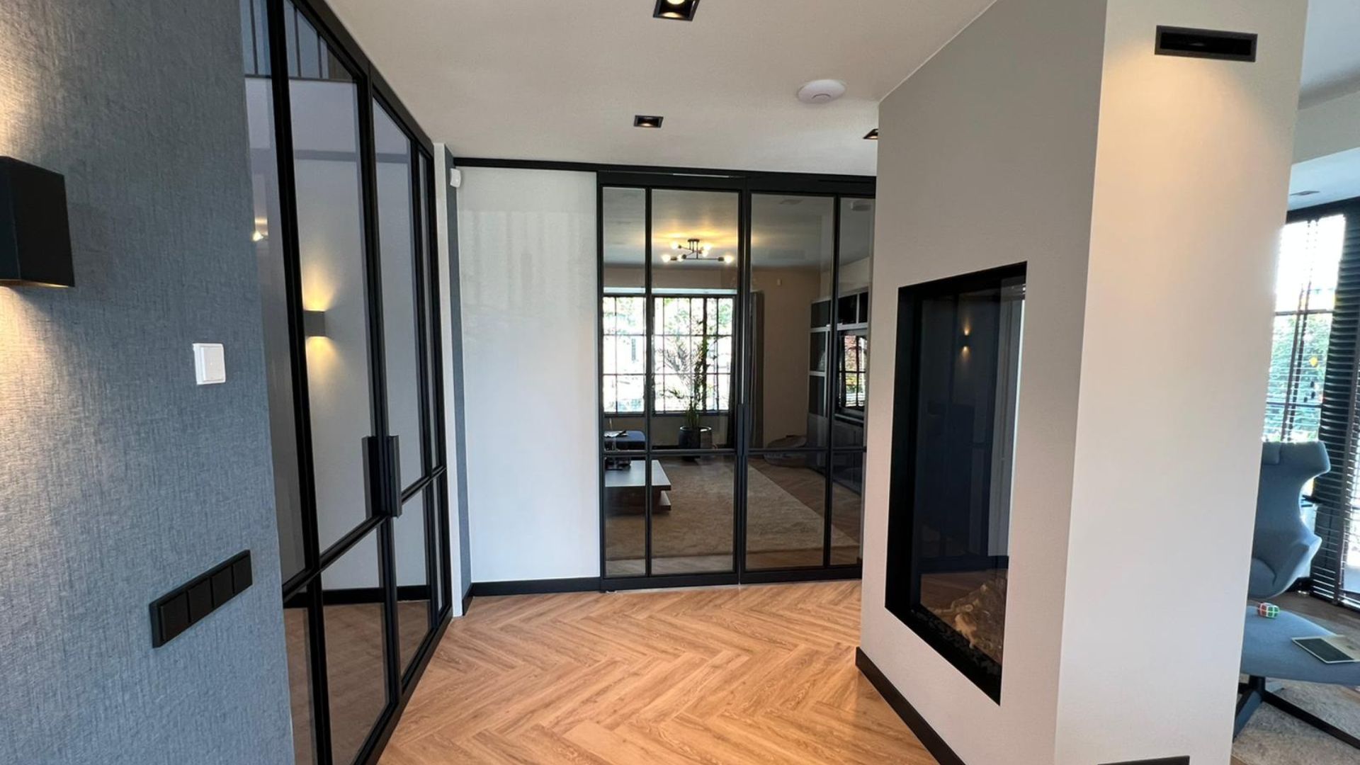 In dit project in Bodegraven zijn er twee sets dubbele taatsdeuren geplaatst en één dubbele schuifdeur. Voor zowel de taatsdeuren als de schuifdeuren is er gekozen voor een asymmetrische kruisverdeling, model Nº 77. Daarnaast zijn de stalen binnendeuren afgewerkt in een matzwarte poedercoating (RAL9005) met een fijn-structuur en zijn ze voorzien van grijs getint glas. Voor een verfijnde- en minimalistische look hebben de binnendeuren een Minimal profieldikte gekregen van 35mm.