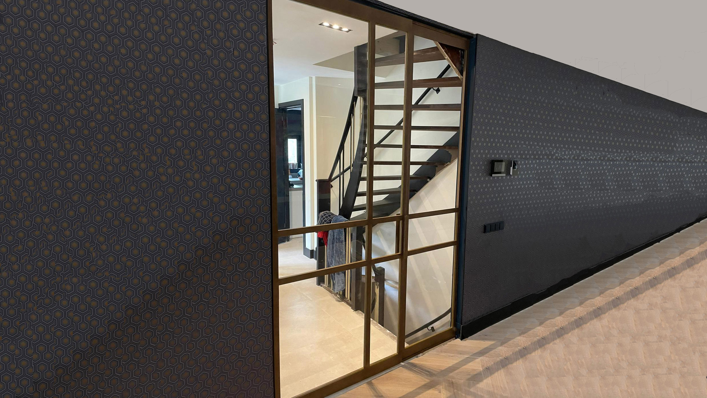 Bekijk hier een voorbeeld van de Skygate Nº8 enkele taatsdeur in combinatie met Skygate Nº5 vast paneel met een Minimal profiel in de kleur Edel Brons.