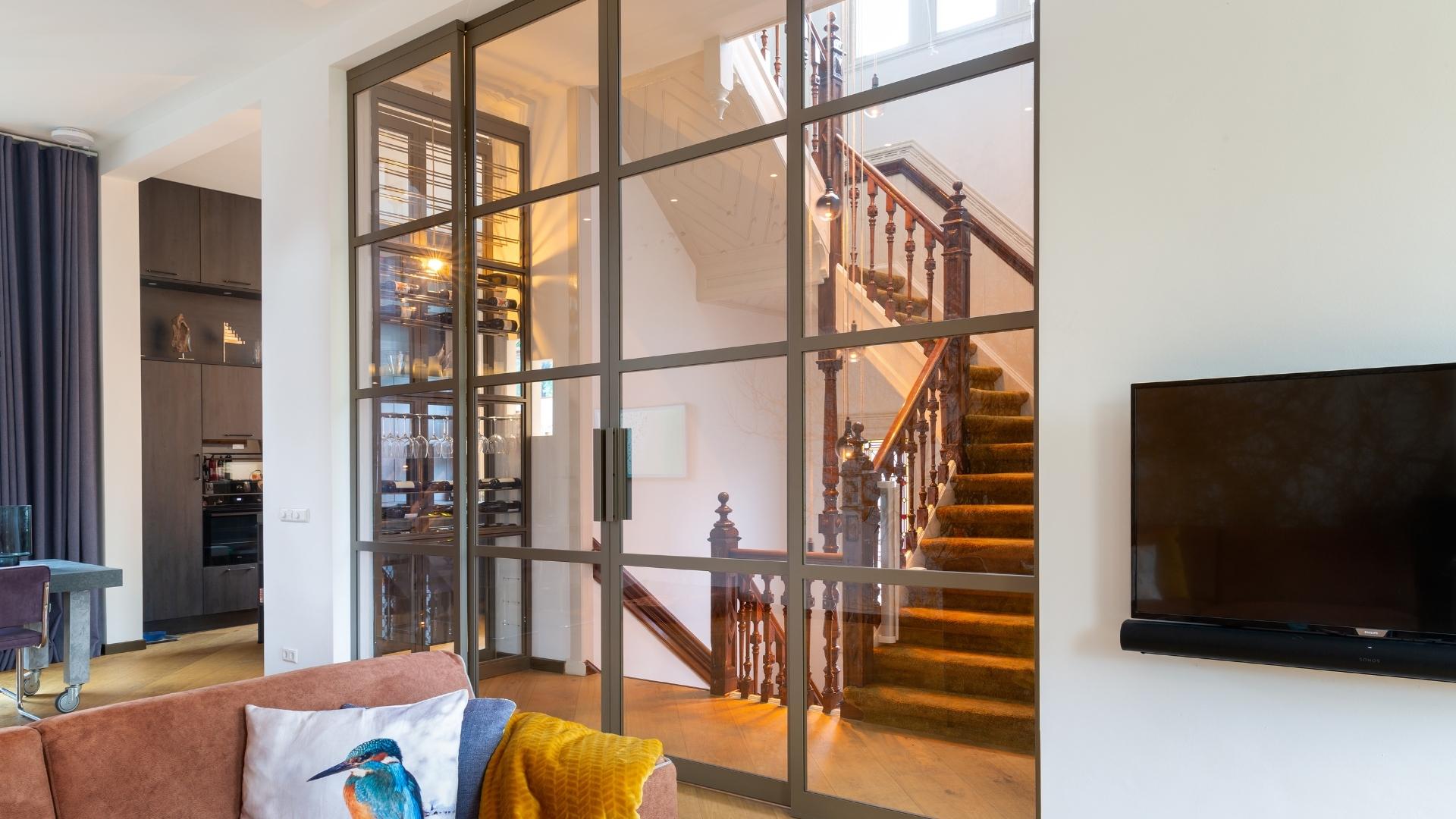 Skygate taatsdeuren kun je eindeloos combineren met vaste panelen tot een complete glazen wand in de kamer en suite of tussen de keuken en eetkamer.